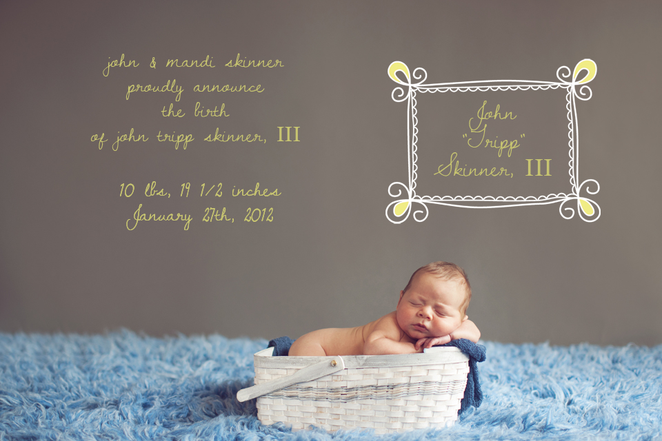 Mandi & John contacted me because they had thought about getting Baby Tripp’s pictures made but hadn’t found anyone they really liked. Chris and Amanda, a former bride and groom (and soon to be parents!), recommended me. Although 6 weeks is a little older than usual for newborn images Mandi thought he could do it so we did! He rocked them! Slept pretty good and then at the end work up and was ready to hang out. He is such a doll! His parents said they were interested in running (their first date was on a run-talk about athletic!) and John loves to deep sea fish and fish does he!? I checked out his facebook page and the man can fish! Enjoy Baby Tripp-he was a joy!